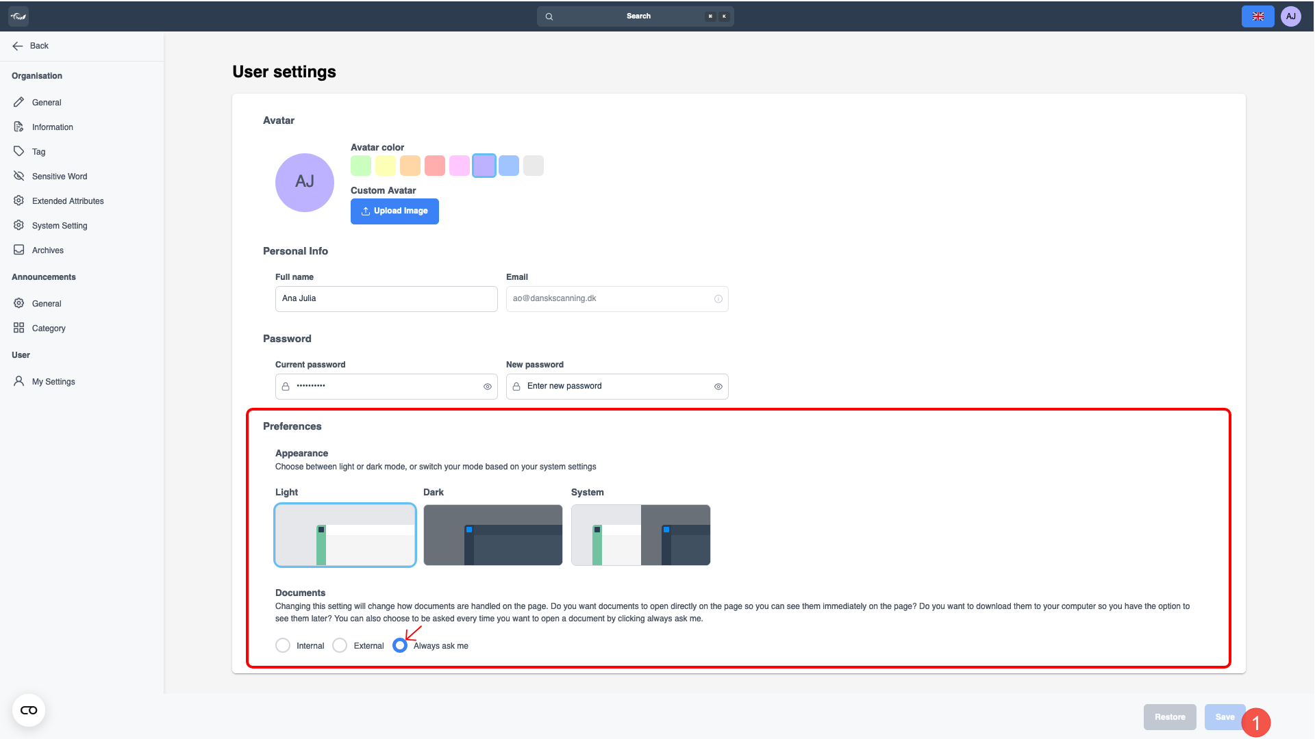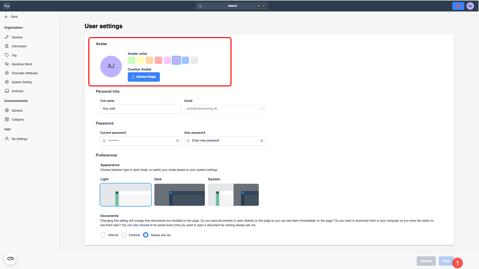 Hier können Sie Ihre persönlichen Daten oder Kontoinformationen einfach aktualisieren. Beachten Sie, dass Sie zwar Ihr Passwort ändern können, Ihre E-Mail-Adresse jedoch nicht direkt aktualisiert werden kann. Wenn Sie Ihre E-Mail-Adresse ändern müssen, wenden Sie sich einfach an Dansk Scanning, um Unterstützung zu erhalten. Der von Ihnen gewählte Name wird als Initialen in Ihrem Logosymbol angezeigt, es sei denn, Sie haben ein benutzerdefiniertes Avatarbild ausgewählt.