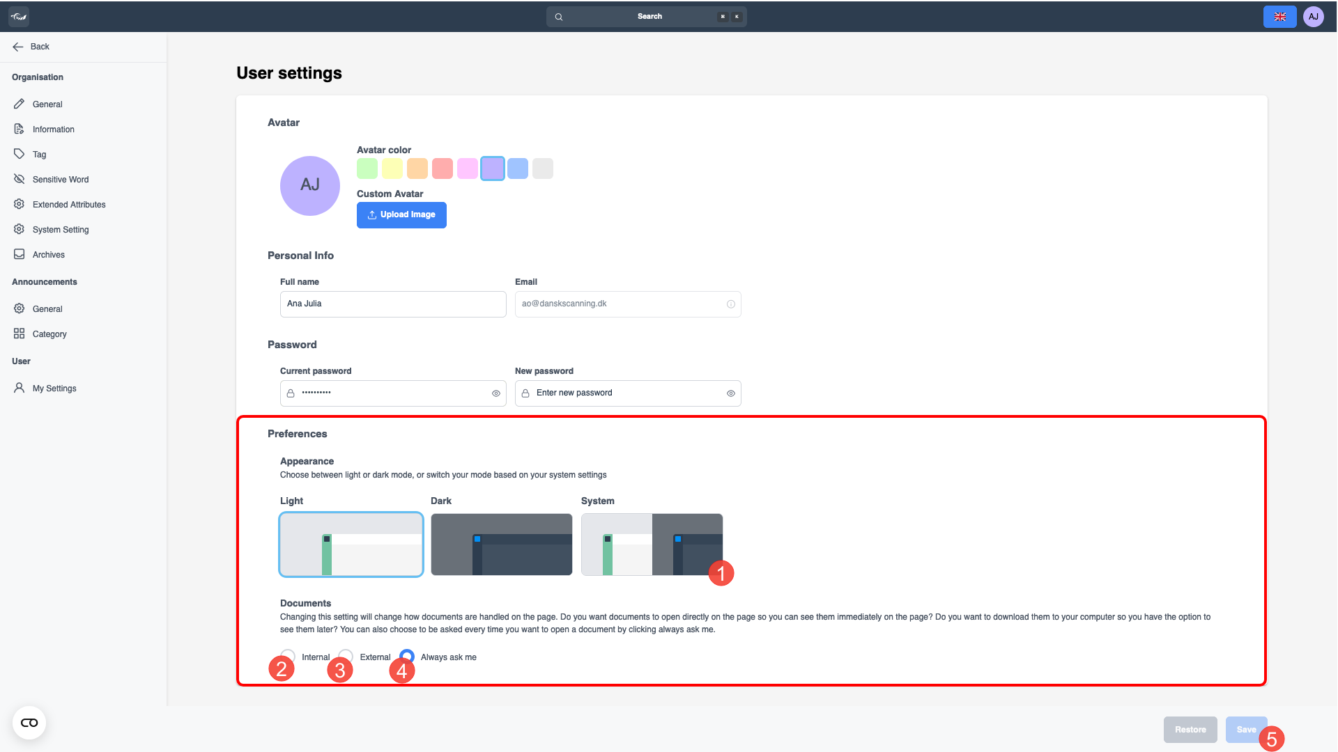 You can easily update your personal details or account information here. Keep in mind that while you can change your password, your email address can’t be updated directly. If you need to change your email, simply contact Dansk Scanning for assistance. The name you choose will appear as initials in your logo icon unless you selected a custom avatar picture.