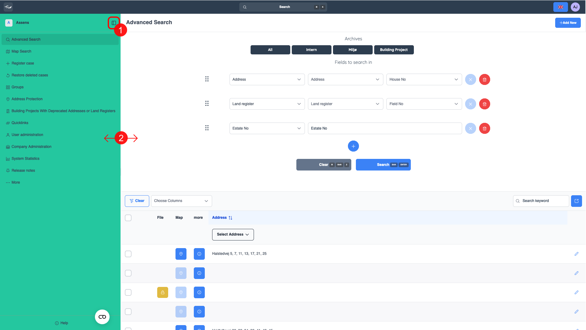 Klikk her for å minimere/skjule sidemenyen. (1) Du kan også trykke «Q» som en snarvei på tastaturet.